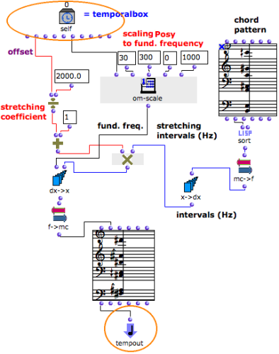 The resulting list of frequencies is converted into midicents by f->mc and returned to a chord box. This chord becomes the musical value of the box via a connection to the Tempout.