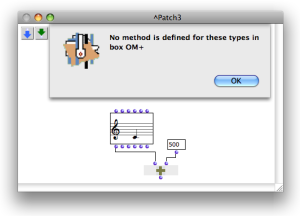 Here is a widespread error when using object boxes : In this example, we want to transpose a chord using OM+. To execute an operation, a function must apply to the right argument : the relevant output must be connected to the function. No method is defined in OM+ for arguments of type chord, so the "self" (1st) ouput of the chord box can not be connected to this function box. The "pitch" output (which returns a list of numbers) should be connected instead. | ![]() |