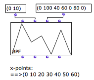 If the x or y list is shorter than the other, the last interval in the shorter list is repeated until the right number of points is reached. For instance, this allows to create a BPF with a list of y-points and a periodic x interval. | ![]() |
