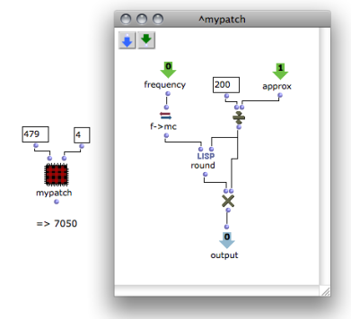 The same patch box can be used on lambda mode with mapcar in order to process a list of input values. Mapcar applies a function to the items of one or more lists, successively. | ![]() |