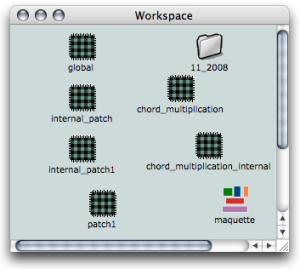 OpenMusic's working environment. Each session starts with choosing a workspace, the equivalent of a desktop where programs are created and organized, and where items can be stored.