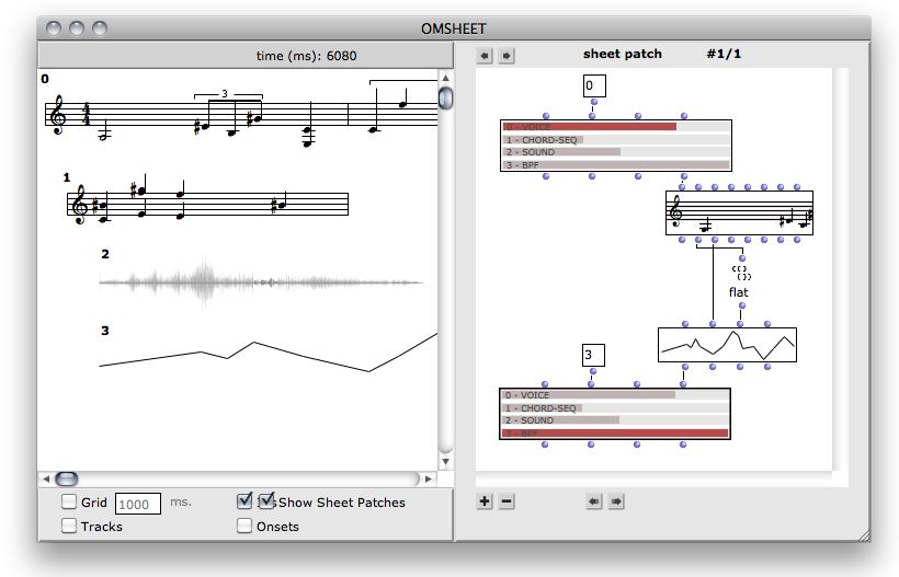 An OMSheet has also a number of attached inbuilt patches (<patch-list>) allowing to generate the contents or link the sheet track objects together.